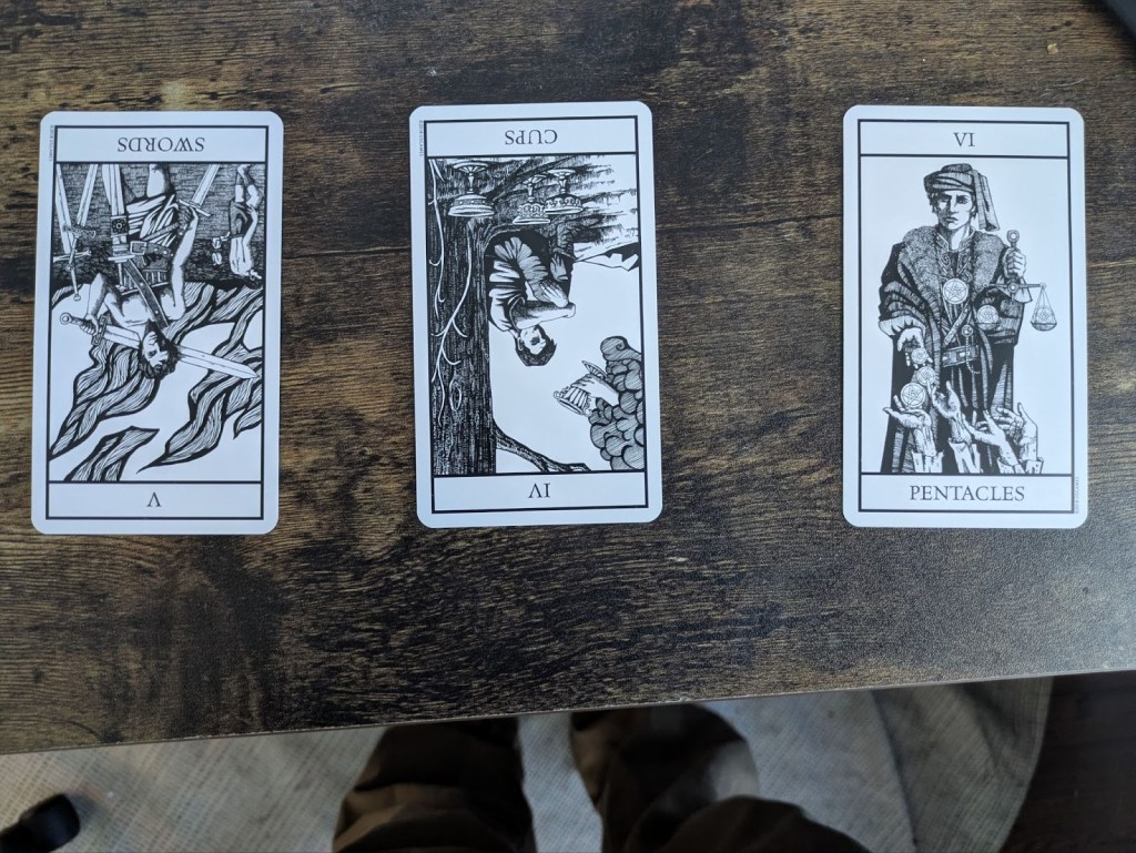 Five of swords reversed in the past position, four of cups reversed in the present position, and six of pentacles in the future position. Starting in the past position, five of swords is a card of conflict and tension; in the upright position it tends to indicate a conflict fought to the bitter end. There are a couple of different interpretations I’ve read of the card reversed, regarding a desire to end conflict or seeing that conflict is something you’ll certainly lose. Another interpretation of the card reversed that I particularly like is that you are no longer fighting that fight, but rather an old wound has been opened, a memory of past conflict. This is particularly apt for the card in the past position.