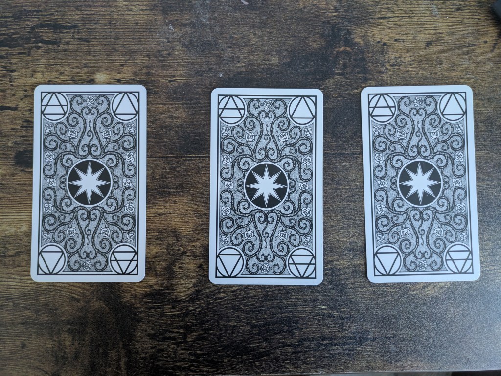 For this month, the first month of the new site and the first tarot spread I’m going to read, I’ll be using a simple three card line. Here, the three cards are intended to represent the past, present, and future. A line such as this makes for a reading with a lot more richness than a single card pull, but nowhere near the complexity of something like a Celtic Cross (I will likely pull a Celtic Cross for some month in the future). The deck for this reading will be my copy of the Bianco Nero Tarot, a beautiful deck with striking black and white artwork.