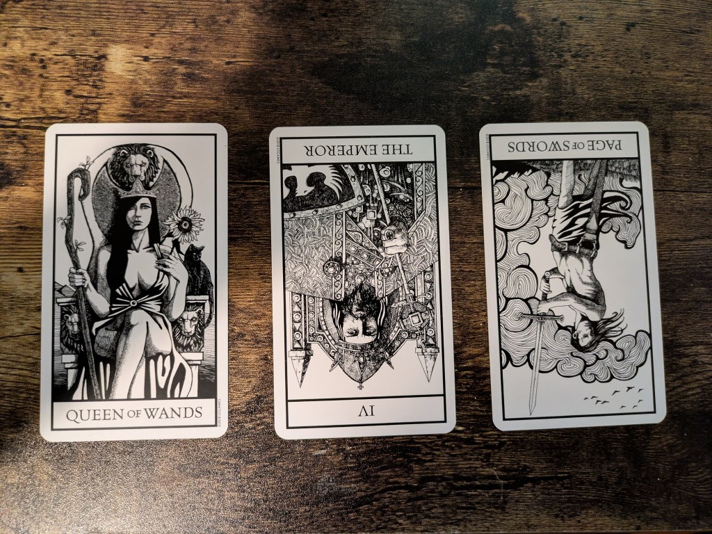 We start with the Queen of Wands in the past position, followed with the Emperor reversed at present, and the Page of Swords reversed in the future position. Once again, let’s read from left to right. The Queen of Wands typically represents a person of focus and achievement, more broadly someone who’s confident and competent. The Emperor is a symbol of power and authority, but in the reversed position this typically means an abuse of power, or feeling like you are being controlled by an overbearing force from without, be that a person like a work superior or an abstract concept like a hierarchy. The Page of Swords is, like the Queen of Wands, a person with energy and enthusiasm, but this is more of an intellectual sort of energy, a person brimming with ideas, questions, and wit. When reversed, this tends to be aligned with the downsides that come with intellectual energy, like being manipulative, hurtful, and obsessed with being right. Another reversed interpretation could be that the intellectual energy represented by the Page is being squandered, resulting in boredom, indecision, or a lack of ambition.